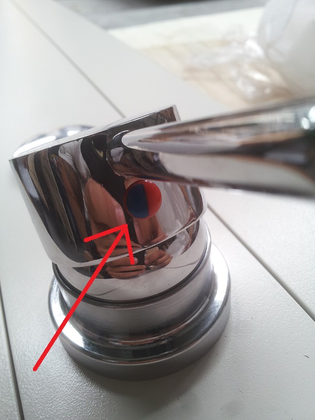 1-Svitare la maniglia del miscelatore, o levare il simbolo blu e rosso :